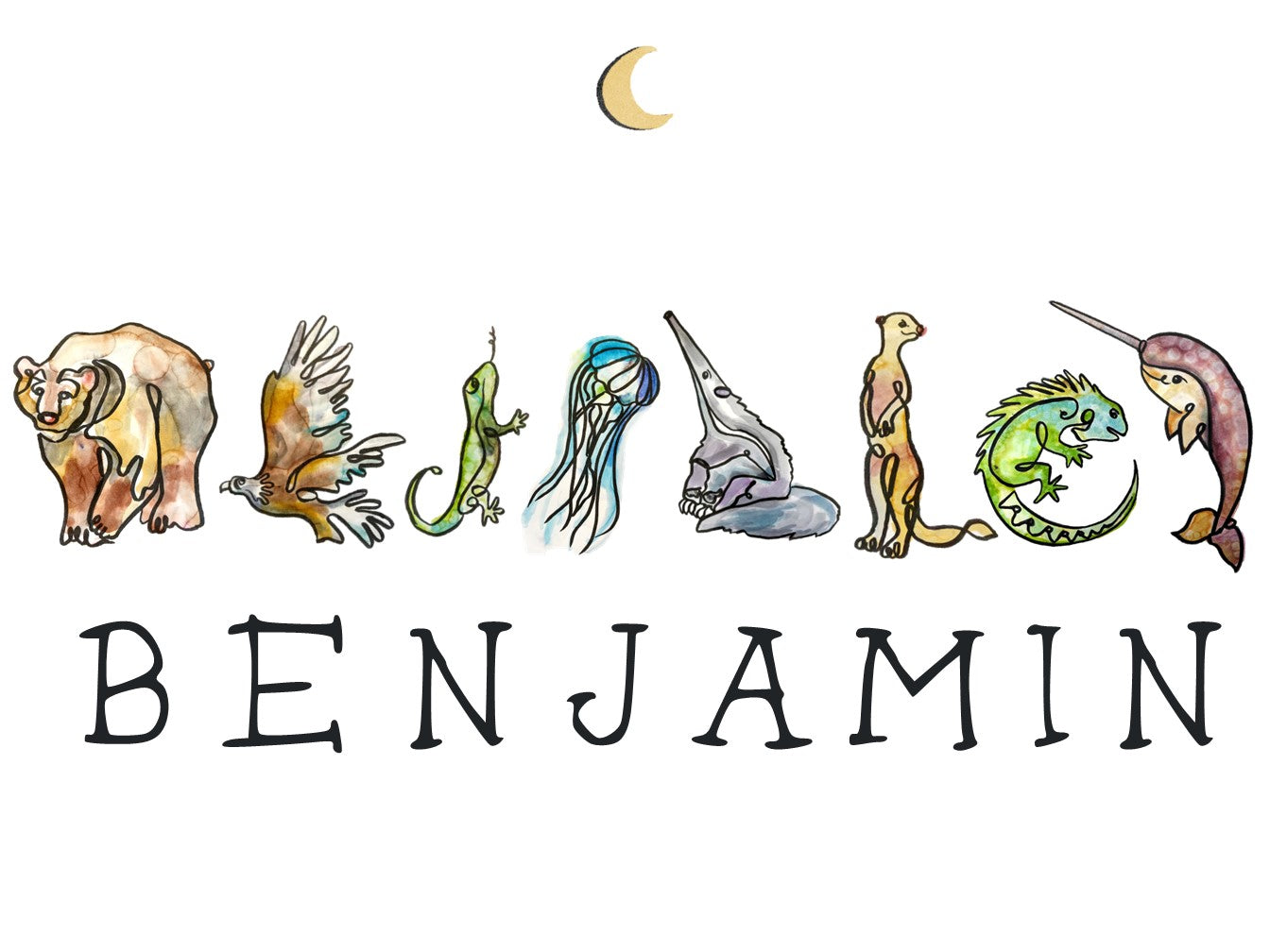 (Each piece includes animals from my existing collection, with up to two new bespoke illustrations drawn specially for your chosen name.)